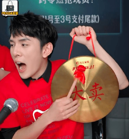 10月20日零點,今年雙十一的第一場直播,這面鑼曾經出現在李佳琦直播間,上面掛著大紅綢子布,他手里拿著紅布裹著的棒槌,一面敲鑼一面對著鏡頭喊話,“不要睡!一睡幾百塊就沒嘍!”