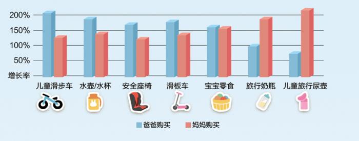 出行過程中無疑需要配備諸多“周邊”。從購買寶寶裝備的不同性別消費數(shù)據(jù)來看,明顯爸爸偏向于“技術(shù)+玩樂派”,愛買滑板車類、安全座椅等,而媽媽們則是“保障派”,從零食、便攜奶瓶到旅行尿壺,不一而足。